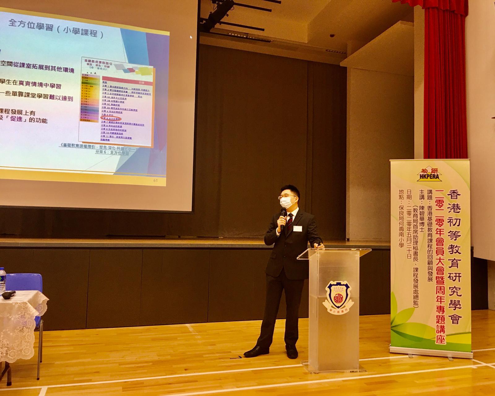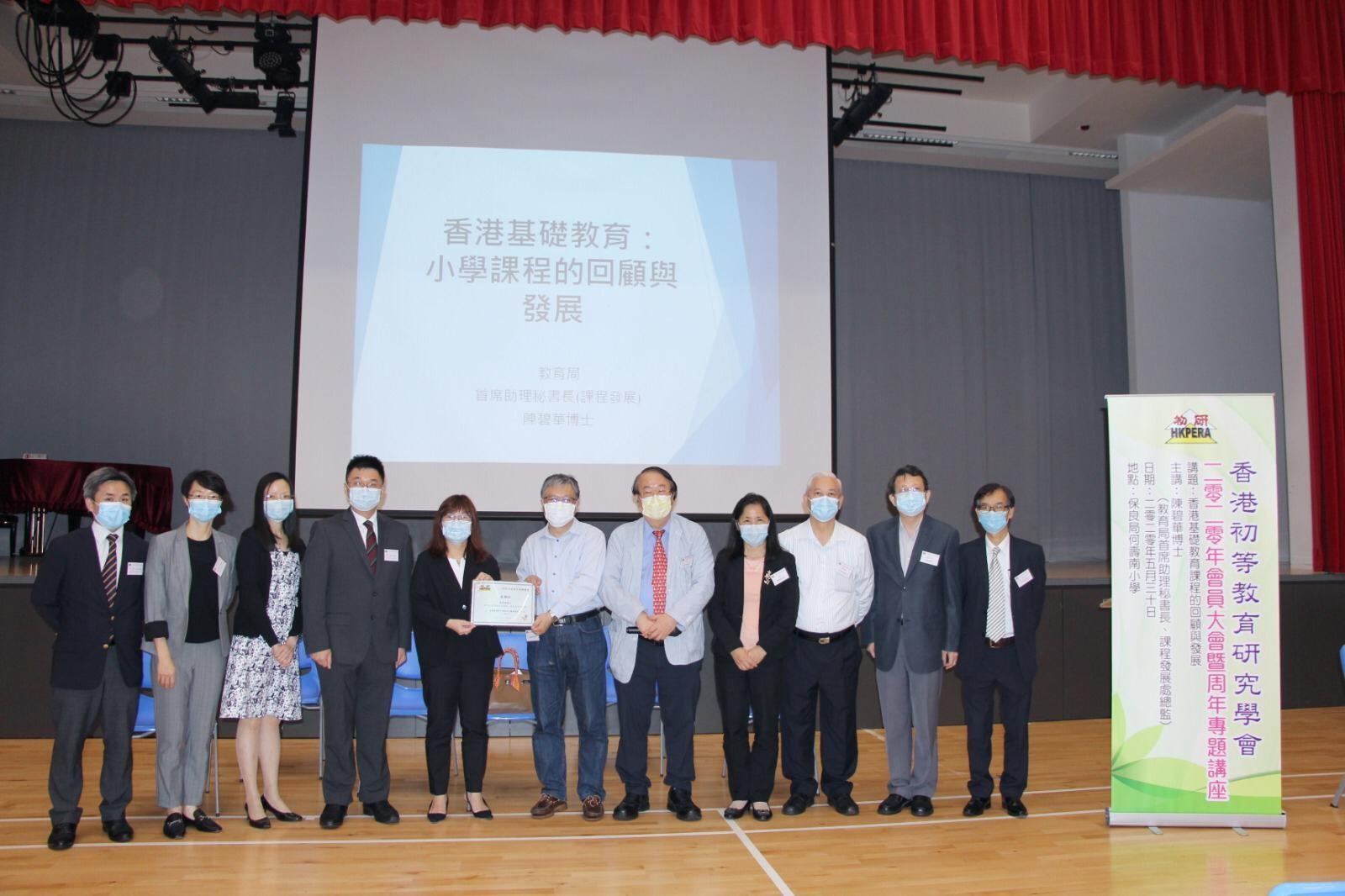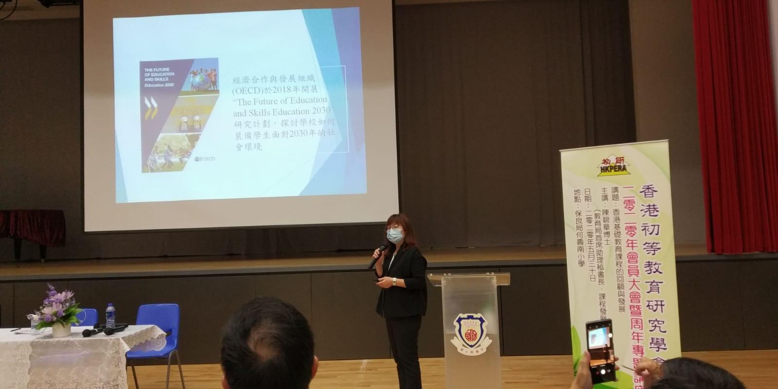 香港初等教育研究學會為了促進同工關注教育發展,每年周年大會皆邀請主講嘉賓從不同角度分享香港教育的看法。2020周年專題講座於5月30日在保良局何壽南小學舉行,由教育局首席助理秘書長(課程發展)陳碧華博士擔任主講,以「香港基礎教育課程的回顧與發展」為題與本會執委和會員分享香港基礎教育課程發展的趨勢。