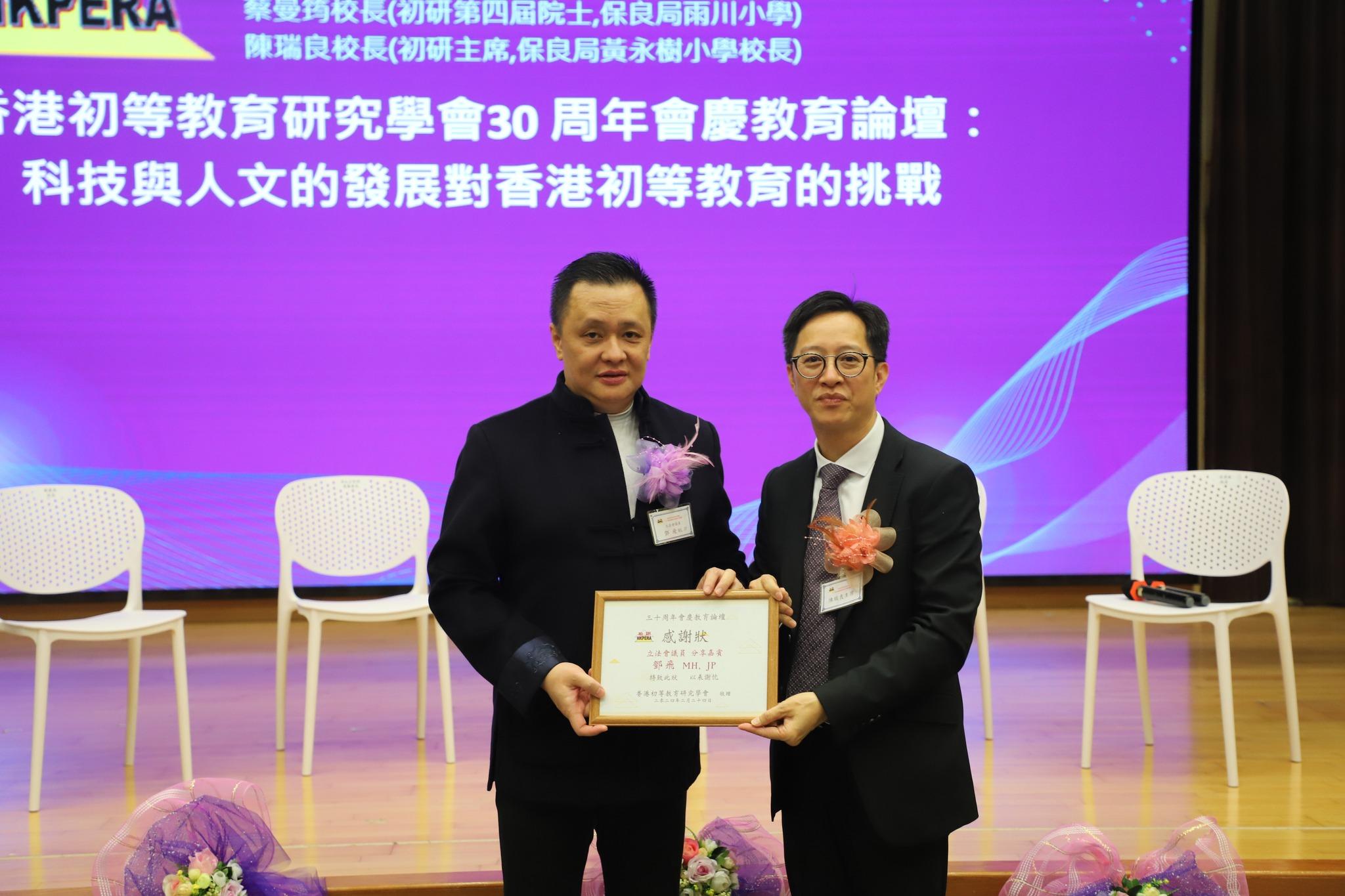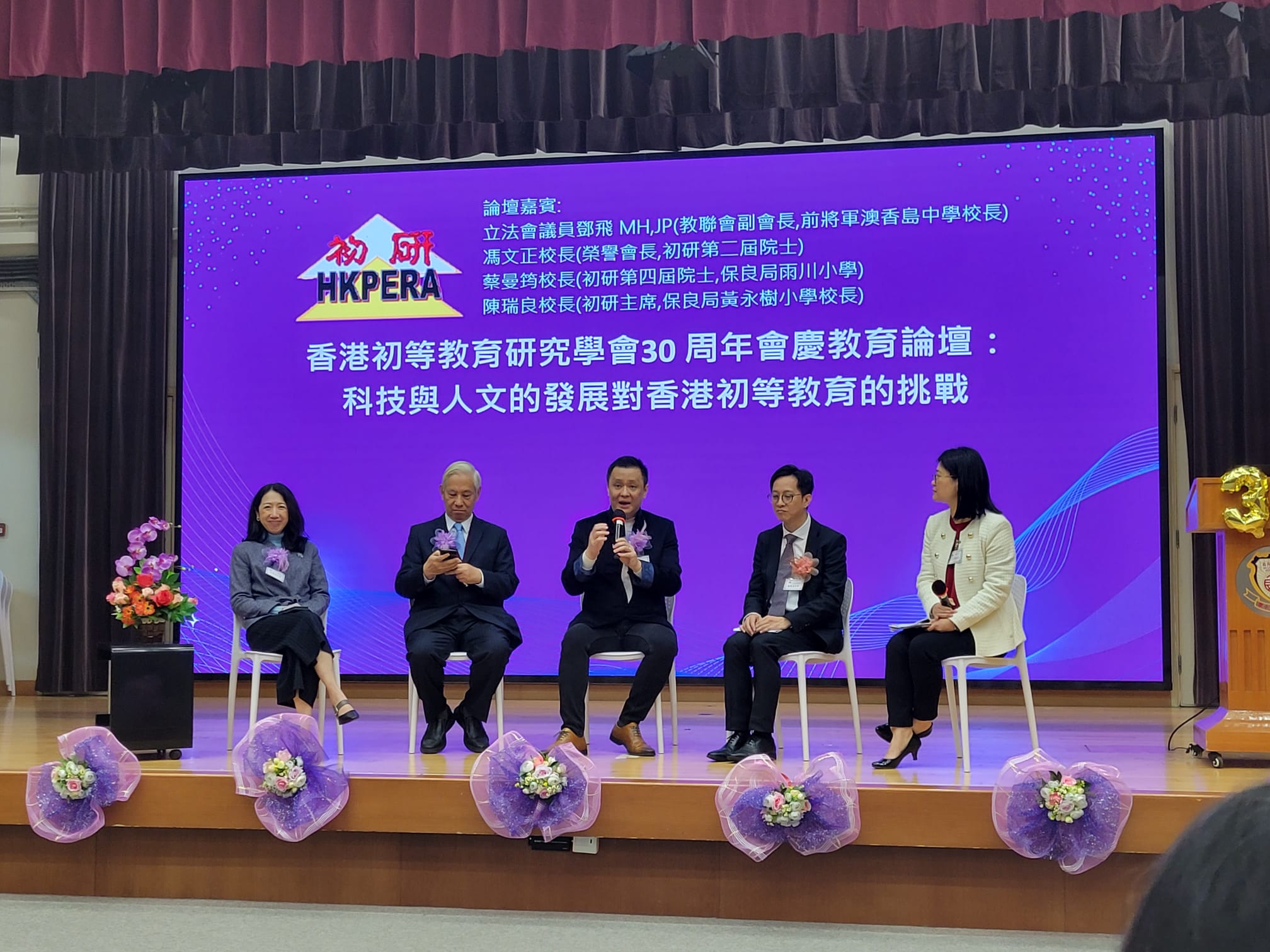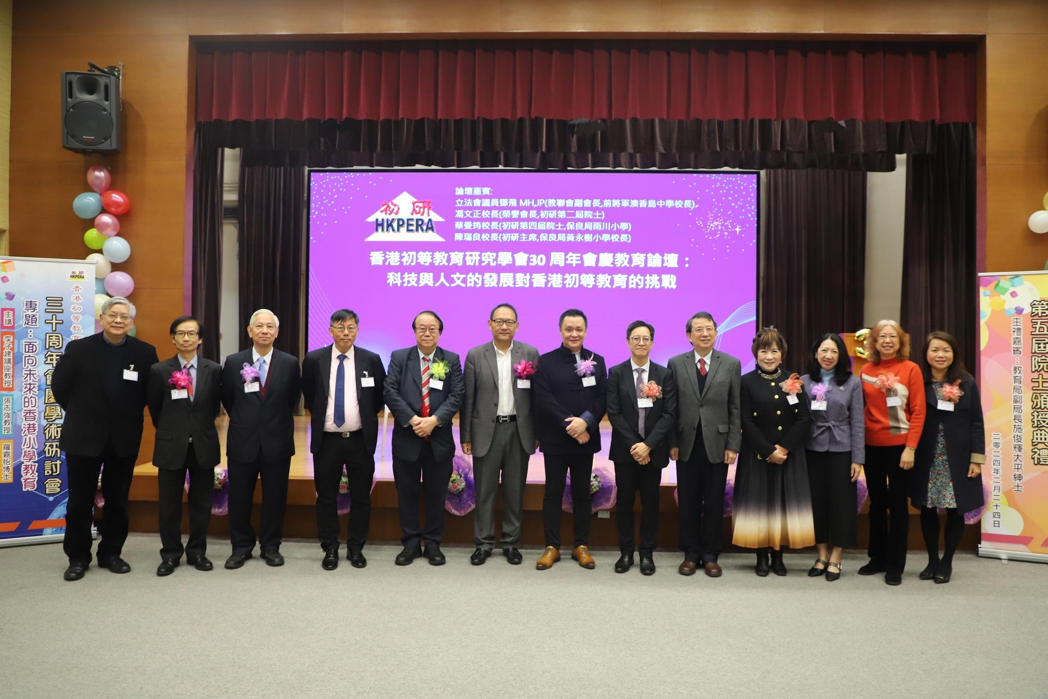 香港初等教育研究學會30 周年會慶教育論壇:科技與人文的發展對香港初等教育的挑戰,論壇嘉賓:立法會議員鄧飛 MH,JP(教聯會副會長,前將軍澳香島中學校長)、馮文正校長(榮譽會長,初研第二屆院士) 、蔡曼筠校長(初研第四屆院士,保良局雨川小學)、陳瑞良校長(初研主席,保良局黃永樹小學校長),論壇主持范秀琪校長。
